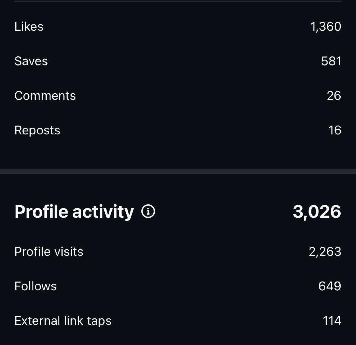 1.360 curtidas. 581 salvamentos. 649 novos seguidores. E 88,3% do alcance vindo de fora da audiência existente.